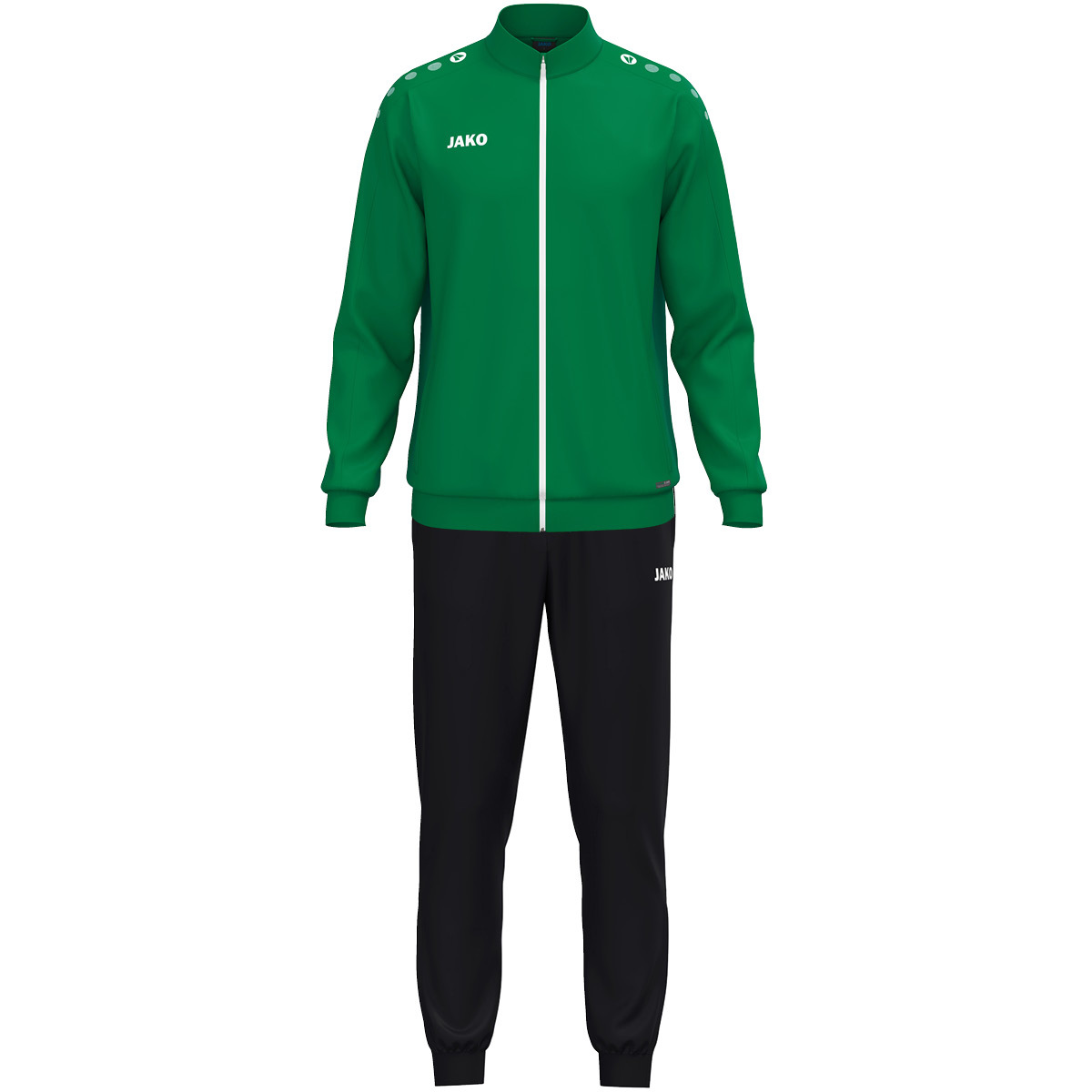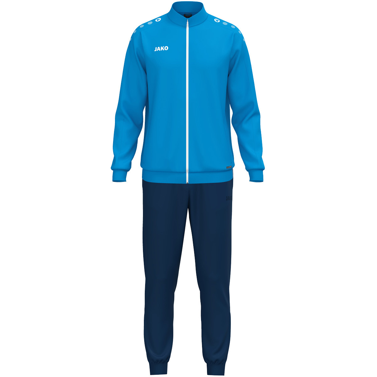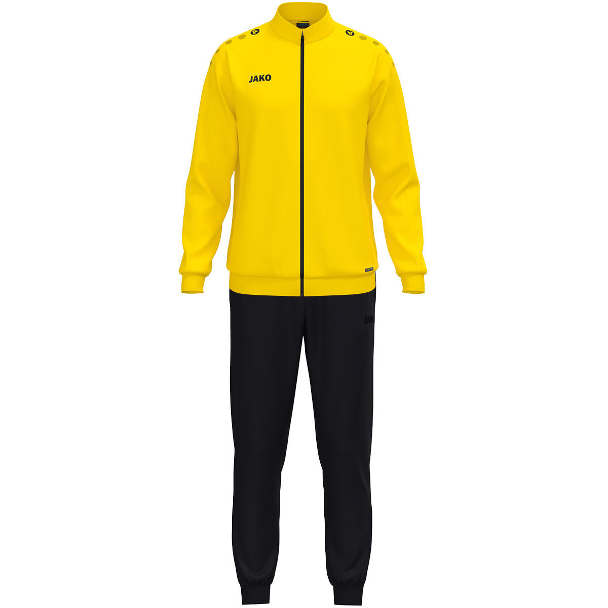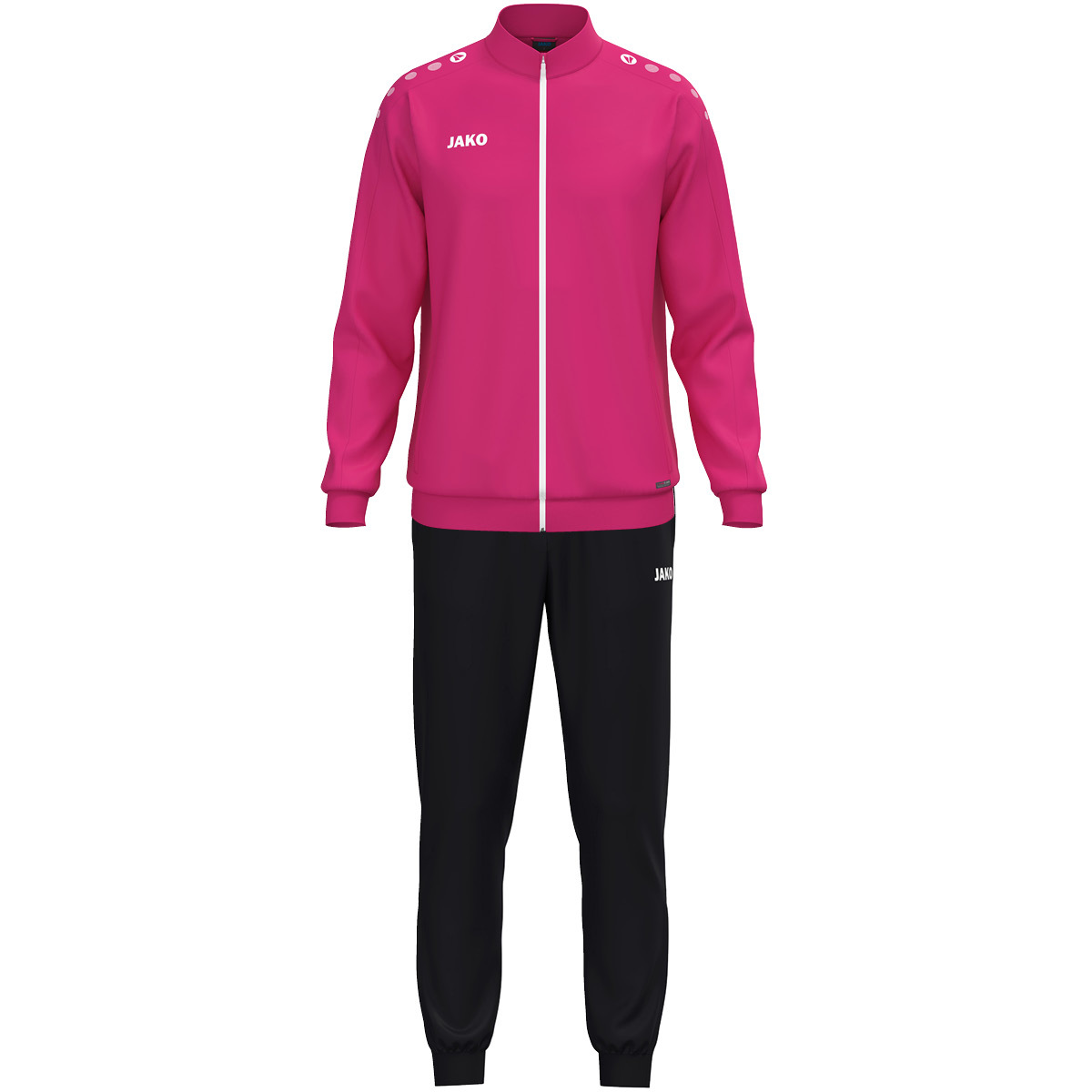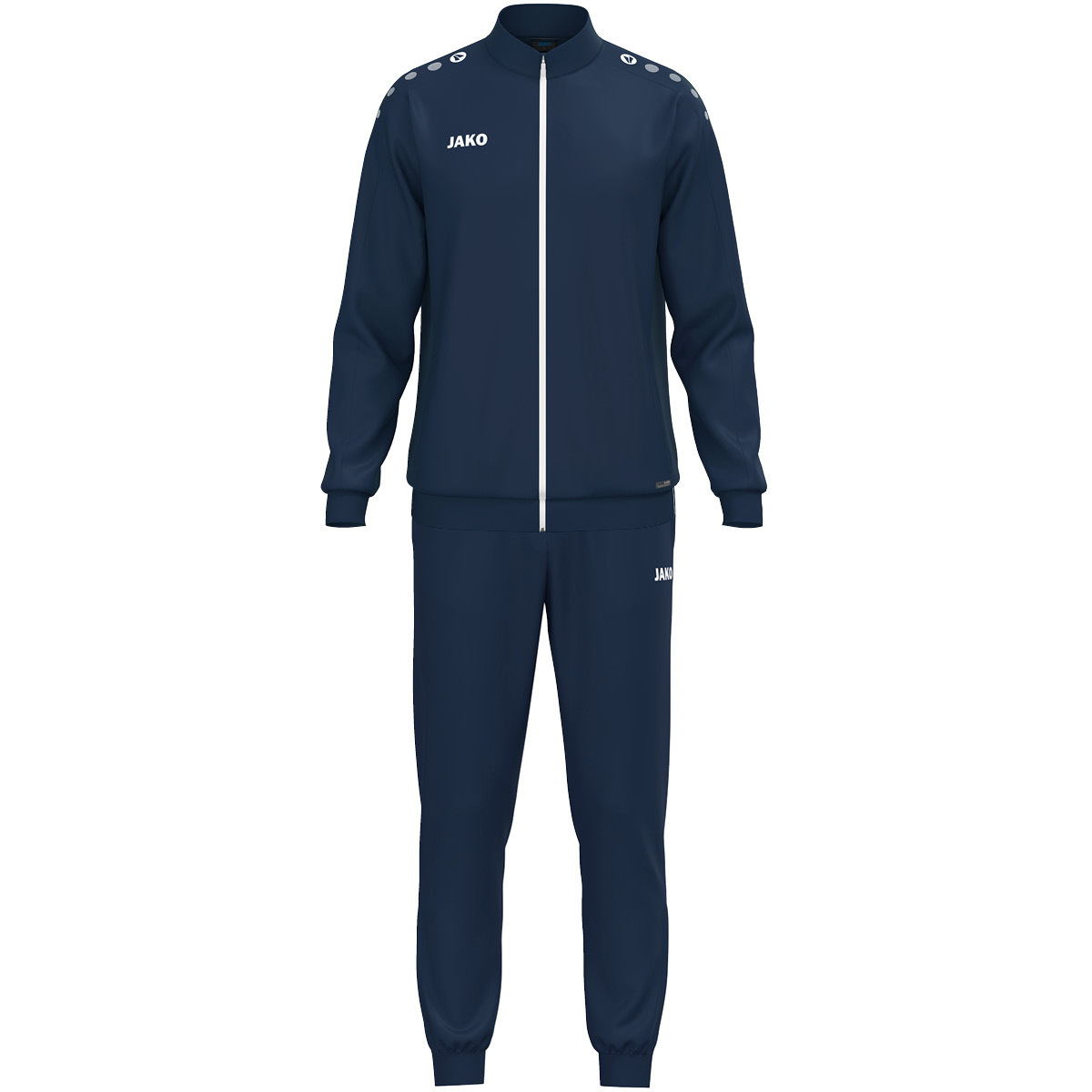 Точки JAKO на плече. Идеально подходит для индивидуальной настройки. Пояс и манжеты в рубчик. JAKO-логотип на правой стороне груди. Ребристый низ с застежкой-молнией. Боковые карманы. Это изделие состоит из: куртки из полиэстера 9300 и брюк из полиэстера 9200.